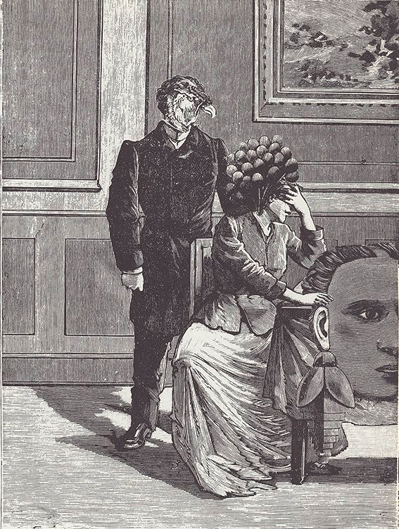 In Tuten’s novel Tallien, the narrator, quoting the 17th century painter Claude Lorrain, says, “The foreground in a picture is always unattractive and art demands that the interest of the canvas should be placed in the far distance, where lies take refuge, those dreams which blossom out of fact and are man’s only love.” The novel has at its foreground the story of Tallien, the French revolutionary, told in an imagined speech delivered to the father from the son. What is the book about? Bringing this to bear on our collage assembled here, the question is plain: Which is the foreground, our designated subject? And that which we see receding in the distance, is it more or less important? The figures of this piece alternately emerge from and retreat into the background, the foreground and background becoming almost interchangeable. Thus, is there a definitive subject in all of this? And is that subject, too, just a mirror back? The suggestion of a hand at work? Are all works of art self-portraits finally? The question cannot be put off any longer: Is all literature about me?